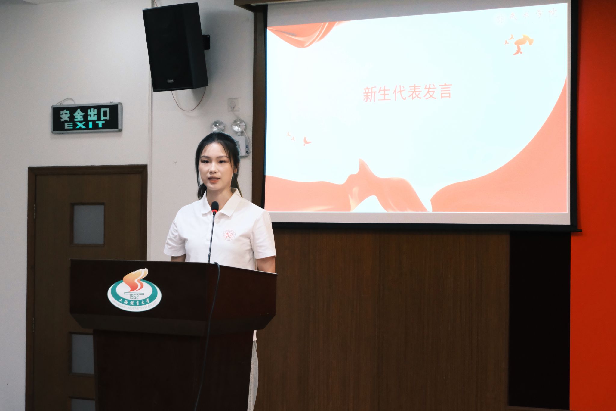 本科新生代表刘若谷在发言中回顾了备考路上“训练场的坚持与书桌前的钻研”,承诺将以“空杯心态”践行“德技兼修、文武并进”的院训,立志成长为“懂技术、通理论、有武德、传文化”的优秀武术人。研究生新生代表罗逸琪分享了从“翻山越岭寻武源”到考研圆梦的心路历程。她表示,学院深厚的名师资源和前沿的学科体系深深吸引着自己,未来将致力于用现代科学解析传统功法,探索武术普惠化传播与国际交流新路径,实现从“学习者”到“研究者”的蜕变,让更多人感受“武的力量”与“德的温度”。